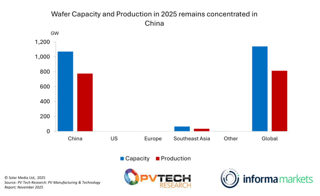 De toda la cadena de suministro (desde el polisilicio hasta los módulos), la etapa de lingote/oblea es la más concentrada en China: el 95 % de la producción mundial se realizará en China en 2025, según los datos de investigación de mercado de PV Tech (consulte el gráfico a continuación). Sólo hay unas pocas instalaciones de fabricación de piezas en funcionamiento fuera de China, y la mayoría de ellas están ubicadas en el sudeste asiático y son propiedad de empresas chinas.